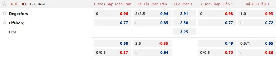 Sàn giao dịch châu Á ghi nhận mức kèo Degerfors được chấp 1/4 trái, tỷ lệ đã xuất hiện ở trận mở màn chiến dịch của đội chủ nhà, khi họ nhận thất bại tan nát. Với Elfsborg, trận mở màn cũng chứng kiến họ chấp đối thủ kèo tương tự trận này và giành chiến thắng.