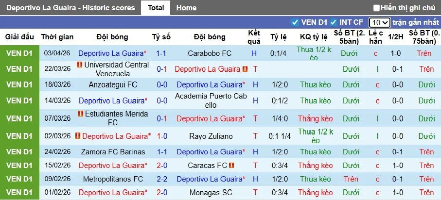 Thống kê phong độ 10 trận đấu gần nhất của Deportivo La Guaira