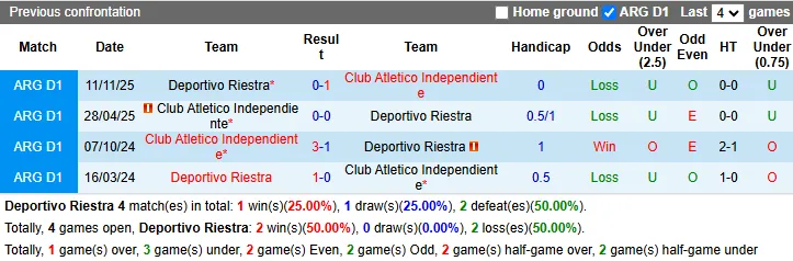 Thống kê chỉ ra rằng cả 21 trận gần đây của Deportivo Riestra đều kết thúc với kết quả có tối đa 2 pha lập công. Independiente trên sân khách cũng có 10/12 trận vừa qua kết thúc mà không vượt mốc 2 bàn thắng.
