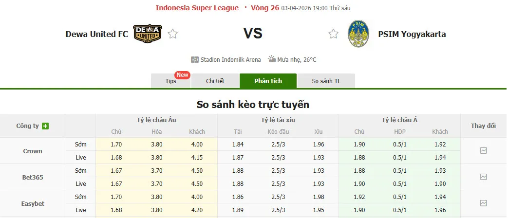Nhận định soi kèo Dewa United vs PSIM Yogyakarta, 19h00 ngày 3/4 tại VĐQG Indonesia. Phân tích tỷ lệ kèo, dự đoán kết quả Dewa United đấu với PSIM Yogyakarta từ tỷ lệ châu Âu, châu Á qua các chuyên gia hàng đầu.