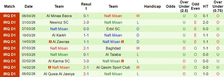 – Thống kê kết quả 10 trận gần nhất của Naft Misan