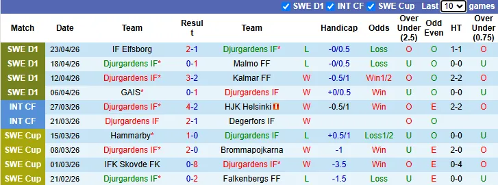 Thống kê phong độ 10 trận gần nhất của Djurgardens