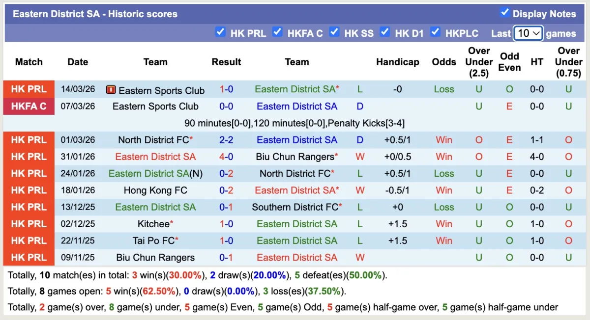 -Thống kê phong độ 10 trận đấu gần nhất của Eastern District SA