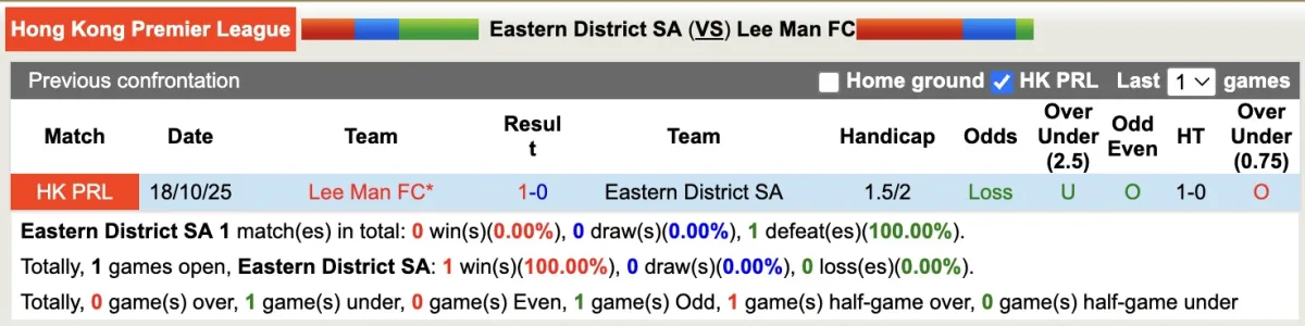 Thống kê phong độ, lịch sử đối đầu của Eastern District SA với Lee Man