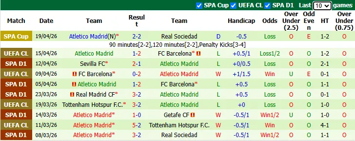 Thống kê phong độ 10 trận gần nhất của Atletico Madrid