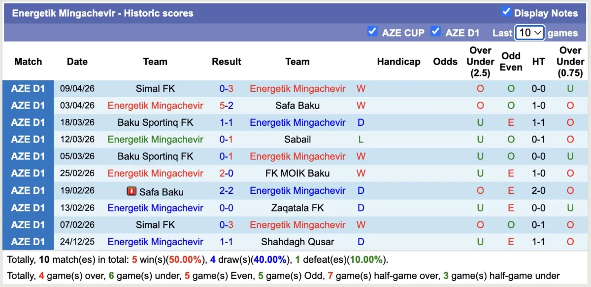 -Thống kê phong độ 10 trận đấu gần nhất của Energetik Mingachevir