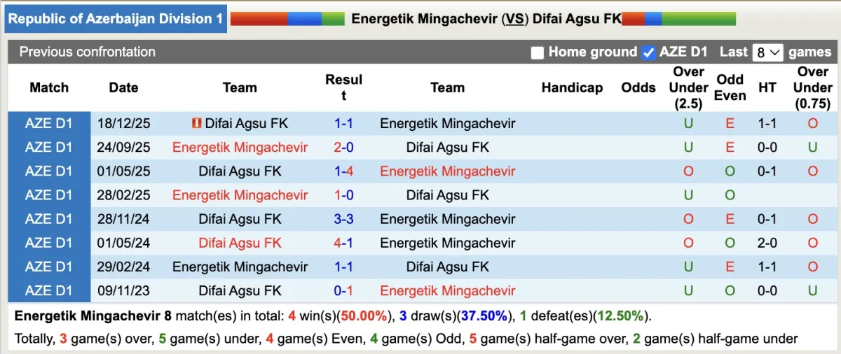 Thống kê phong độ, lịch sử đối đầu của Energetik Mingachevir với Difai Agsu FK