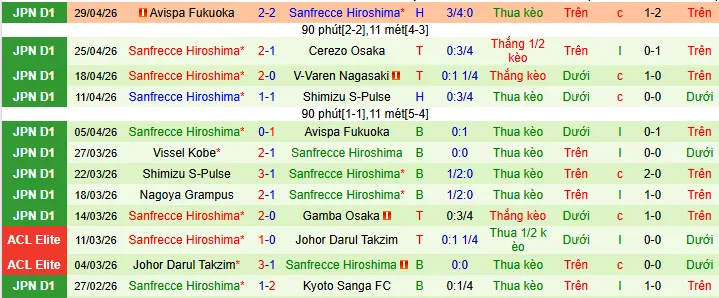 Thống kê phong độ 10 trận đấu gần nhất của Sanfrecce Hiroshima