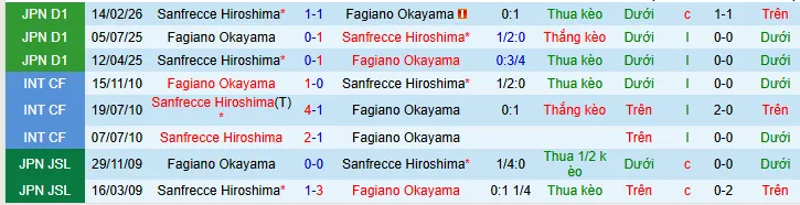 + Fagiano thắng 5 thua 2 trong 7 trận đối đầu với Sanfrecce có mở kèo châu Á.