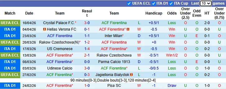 Thống kê phong độ 10 trận gần nhất của Fiorentina