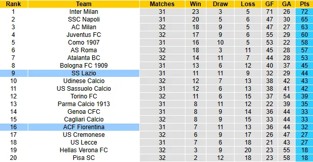 Fiorentina đã thắng 3/4 lần chạm trán Lazio gần nhất. Phong độ sân khách mùa này của Lazio khá phập phù và trong bối cảnh không còn nhiều động lực, đội bóng áo xanh thành Rome hoàn toàn có thể phải nhận thêm một thất bại.