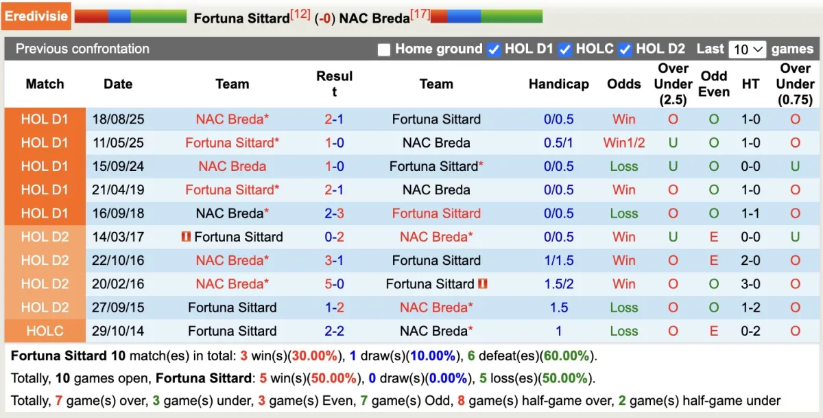 Trong 3 lần đối đầu gần nhất giữa hai câu lạc bộ kể từ khi NAC Breda lên hạng năm 2024. Fortuna Sittard đã thua kèo đến 2 lần. 6/8 trận liên tiếp trên tổ ấm đội chủ nhà đều không vượt ải Handicap, có lẽ NAC Breda sẽ đáng tin ở kèo châu Á.