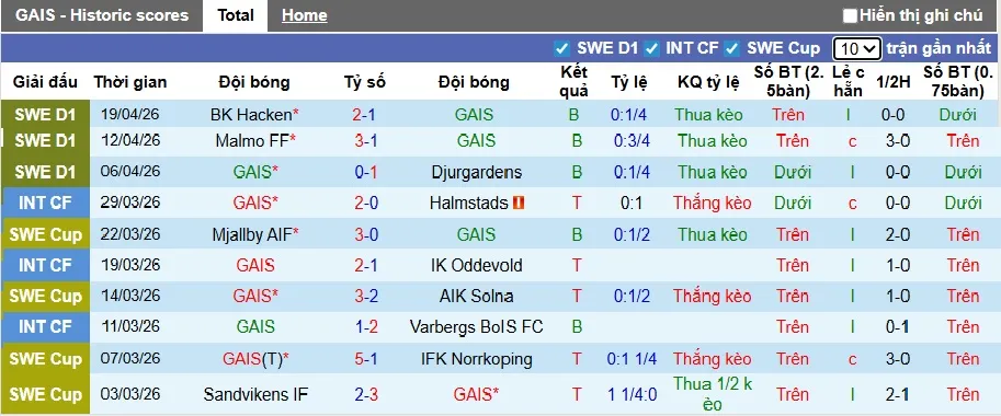 Thống kê phong độ 10 trận đấu gần nhất của GAIS