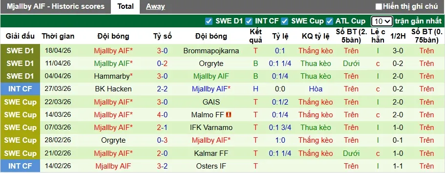 Thống kê phong độ 10 trận đấu gần nhất của Mjallby