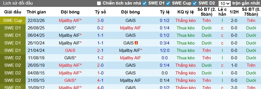 Các cầu thủ GAIS bước vào trận đấu đêm nay với mạch 3 trận liên tiếp toàn thua theo cả chuyên môn và kèo châu Á. Đội chủ nhà cùng Kalmar và Goteborg là ba đội bóng có tỷ lệ thắng kèo châu Á bằng 0 sau 3 trận đấu đầu tiên. Với Mjallby, đội khách thắng kèo 3, hòa 1 và thua 2 trong 6 trận vừa qua trên mọi đấu trường. Mjallby cũng thắng kèo 2 trận đối đầu gần nhất, bao gồm trận đấu tại cúp quốc gia cuối tháng 3 vừa qua.