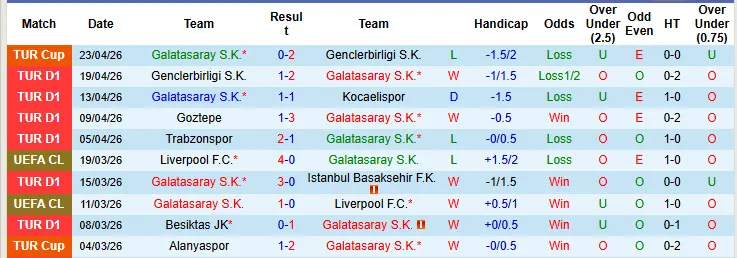 Thống kê phong độ 10 trận đấu gần nhất của Galatasaray