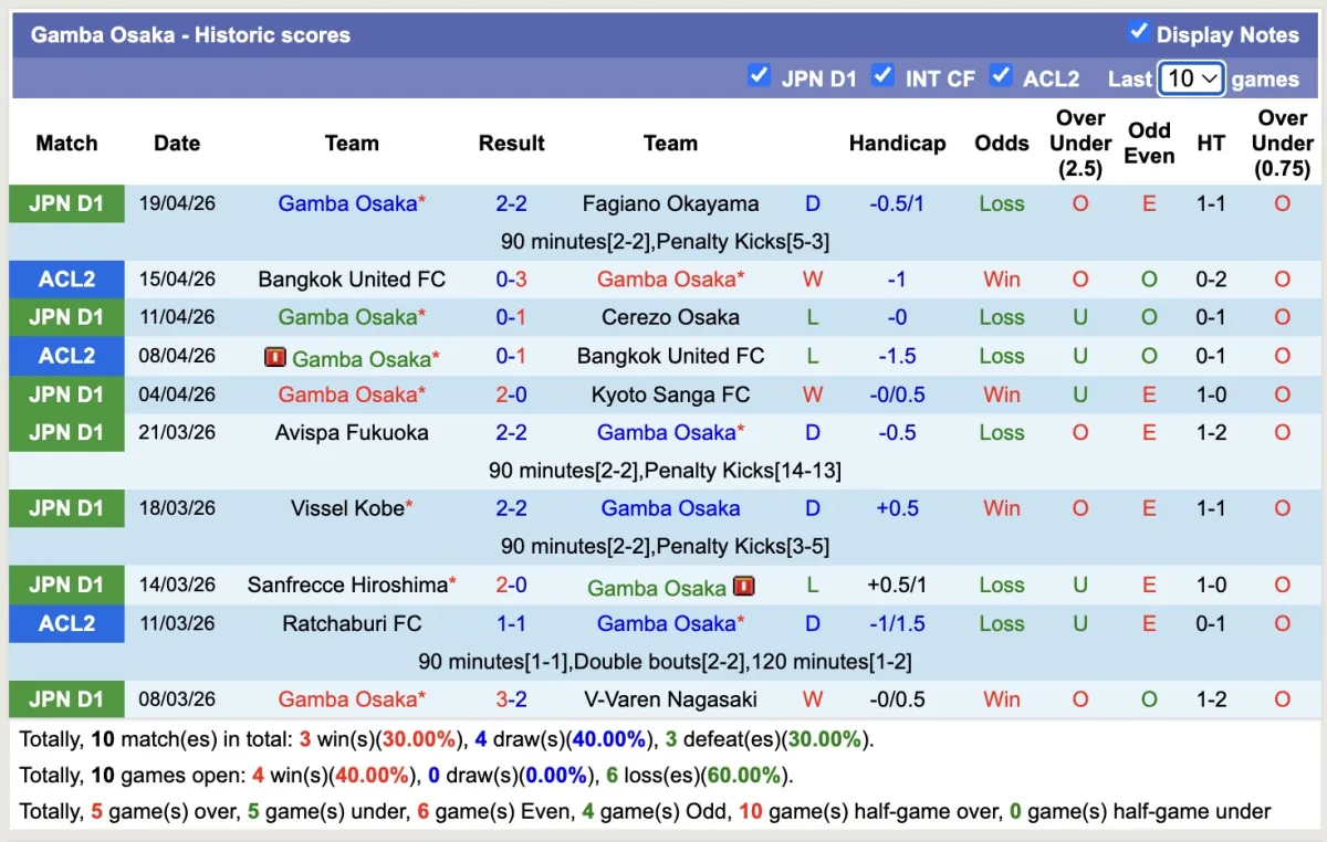 -Thống kê phong độ 10 trận đấu gần nhất của Gamba Osaka