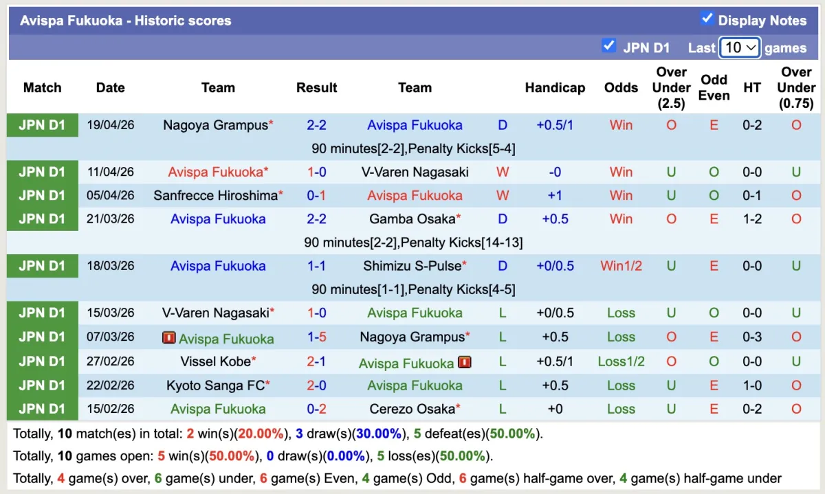 -Thống kê phong độ 10 trận đấu gần nhất của Avispa Fukuoka
