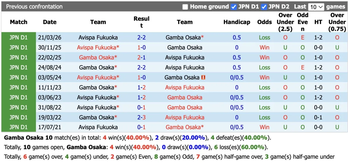 Thống kê phong độ, lịch sử đối đầu của Gamba Osaka với Avispa Fukuoka