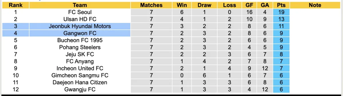 Gangwon cũng là một đội bóng không dễ bị bắt nạt, ùa trước họ đã cán đích tại vị trí thứ 5 và hiện tại mùa này sau 7 vòng đấu đội chủ nhà đang sở hữu 9 điểm, đứng thứ 4 trên bảng xếp hạng và kém đối thủ trận đấu này 2 điểm.