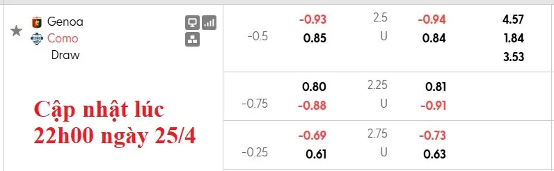 Dù mức chấp dành cho Como ở trận đấu này đã bị hạ từ 3/4 xuống còn 1/2 trước giờ bóng lăn. Tuy nhiên, đội khách vẫn là những người đáng tin cậy. Từ đầu mùa, họ thắng kèo châu Á đến 18 trận, đứng thứ 3 giải đấu, còn Genoa chỉ có 12 trận.