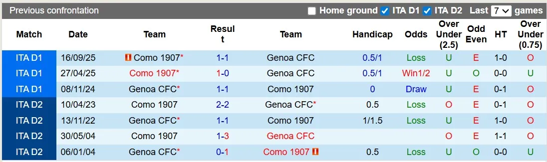 Thống kê phong độ, lịch sử đối đầu của Genoa đấu vs Como