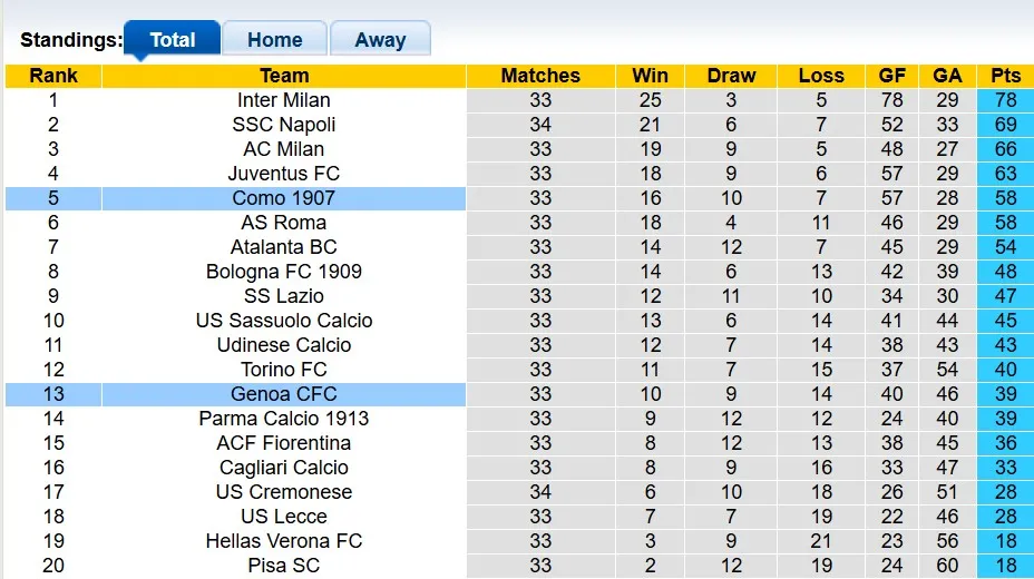 Tuy nhiên, với đội bóng mới chỉ có mùa giải thứ 2 tại Serie A, việc có thể có vé dự cúp châu Âu cũng đã là thành công lớn. Como hiện đứng thứ 5 với 58 điểm. Trước vòng đấu này, họ bằng điểm với AS Roma. Cuộc cạnh tranh vị trí thứ 5 hiện tại cũng rất căng thẳng.