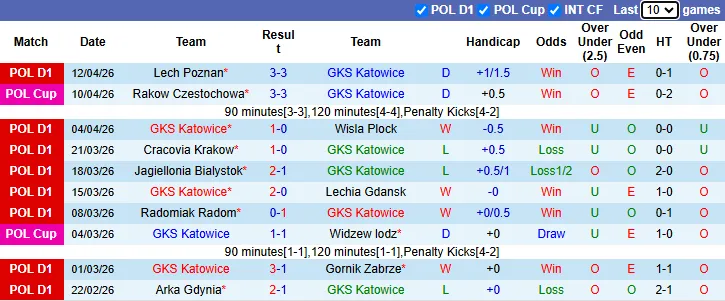 Thống kê phong độ 10 trận gần nhất của GKS Katowice