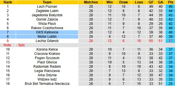 GKS Katowice đang đứng thứ 7 trên bảng xếp hạng với 40 điểm sau 28 vòng đấu. Đội bóng của HLV Rafał Gorak vừa có một trận hòa đầy quả cảm 3-3 trước đội đầu bảng Lech Poznan, cho thấy tinh thần chiến đấu quật khởi và hàng công đang vào phom. Đặc biệt, ngôi sao Bartosz Nowak vẫn là linh hồn trong lối chơi của đội chủ nhà với khả năng kiến tạo cơ hội hàng đầu giải đấu.