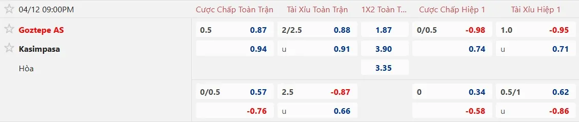 Sàn giao dịch châu Á ghi nhận mức kèo Goztepe chấp 1/2 trái, tỷ lệ mà đội bóng này tương đối có duyên khi tiếp đón Kasimpasa trên sân nhà, khi toàn thắng cả 2 trận gần nhất xuất hiện. Chưa kể, 2 trận đấu gần đây mà Goztepe chấp 1/2 trái cũng chứng kiến họ giành chiến thắng.