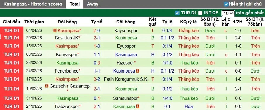 Với 13 điểm sau 14 trận sân khách, Kasimpasa có thành tích khá tốt khi thi đấu xa nhà. Tuy nhiên, kể từ chiến thắng 2-1 trước Alanyaspor hồi tháng 11/2025, họ chưa giành được chiến thắng nào trên sân khách. Đây rõ ràng sẽ là thách thức lớn dành cho Kasimpasa khi làm khách tới sân của Goztepe.