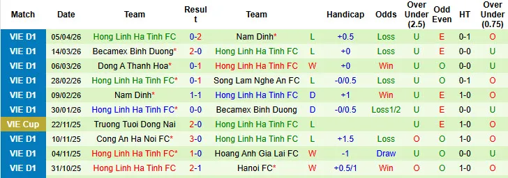 Thống kê phong độ 10 trận đấu gần nhất của Hà Tĩnh