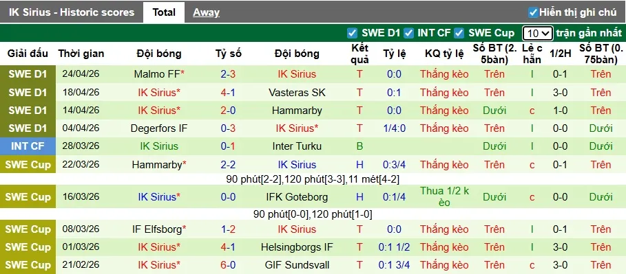 Thống kê phong độ 10 trận đấu gần nhất của Sirius