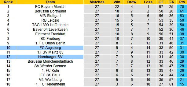 Augsburg hiện chỉ hơn Hamburg đúng 1 điểm trên bảng xếp hạng. Tuy nhiên, điểm yếu lớn nhất của đội khách chính là phong độ kém cỏi mỗi khi xa nhà. Thống kê chỉ ra rằng Augsburg là một trong những đội có thành tích sân khách tệ nhất Bundesliga mùa này khi thua 9/13 trận. Bên cạnh đó, hàng thủ của họ cũng đang gặp vấn đề nghiêm trọng khi đã để lọt lưới tới 50 bàn sau 27 vòng đấu.