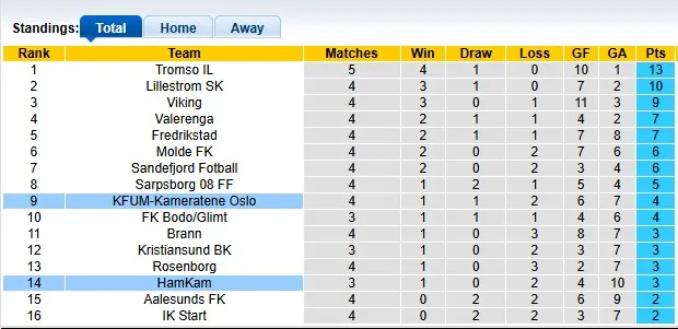 Họ để thua 1-5 trước Brann và sau đó là 1-4 trước Molde. Với 3 điểm sau 3 vòng đấu, đội chủ nhà hiện đứng ở vị trí thứ 14 trong số 16 đội tại giải VĐQG Na Uy. Trong khi đó, tình thế của KFUM cũng tương tự đối thủ.
