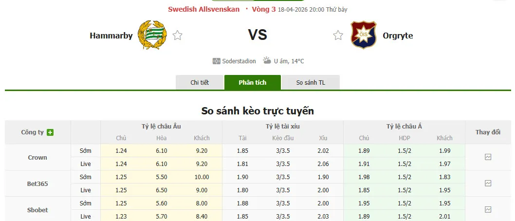 Nhận định soi kèo Hammarby vs Orgryte, 20h00 ngày 18/4 tại VĐQG Thụy Điển. Phân tích tỷ lệ kèo, dự đoán kết quả Hammarby đấu với Orgryte từ tỷ lệ châu Âu, châu Á qua các chuyên gia hàng đầu.