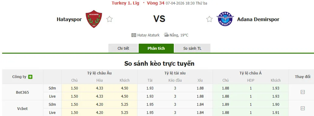 Nhận định soi kèo Hatayspor vs Adana Demirspor, 18h30 ngày 7/4 tại hạng Nhất Thổ Nhĩ Kỳ. Phân tích tỷ lệ kèo, dự đoán kết quả Hatayspor đấu với Adana Demirspor từ tỷ lệ châu Âu, châu Á qua các chuyên gia hàng đầu.