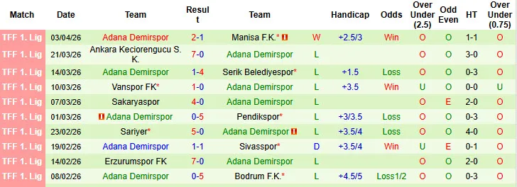 Thống kê phong độ 10 trận đấu gần nhất của Adana Demirspor