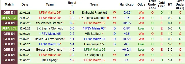 Thống kê phong độ 10 trận đấu gần nhất của Mainz 05