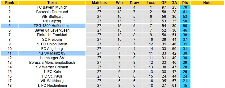 Trở lại với vòng 28 diễn ra cuối tuần này, Hoffenheim ra sân với nhiệm vụ phải giành trọn 3 điểm để không bị tụt lại trong cuộc đua tranh top 4. Nhìn qua, đây là nhiệm vụ nằm trong tầm tay đội bóng thành Sinsheim khi họ được thi đấu trên sân nhà và đối thủ là đội bóng có thứ hạng thua kém Mainz. Tuy nhiên, với nhiều người hâm mộ trung lập, Hoffenheim là đội bóng có nguy cơ để rơi điểm.