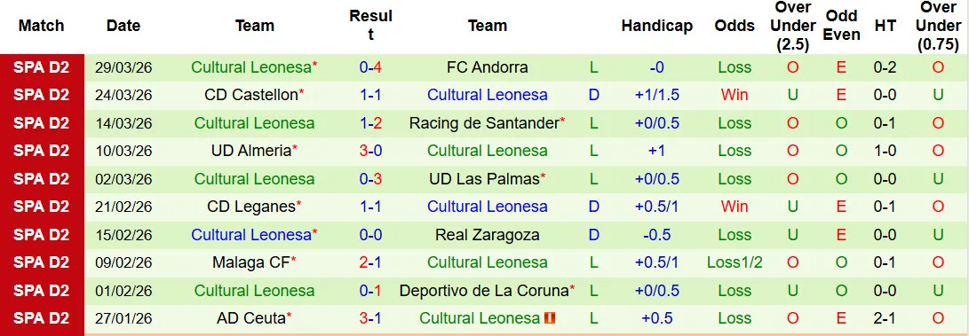 Thống kê phong độ 10 trận đấu gần nhất của Cultural Leonesa
