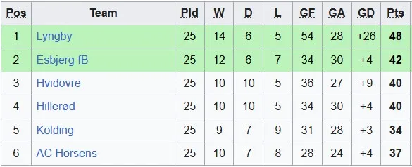 Tại giải hạng nhất Đan Mạch, ngoại trừ Lyngby đang có nhiều lợi thế trong cuộc đua thăng hạng tại nhóm play-off đầu tiên, 4 đội tiếp theo dường như đang trong cuộc đua căng thẳng, cam go để giành vé thăng hạng còn lại.
