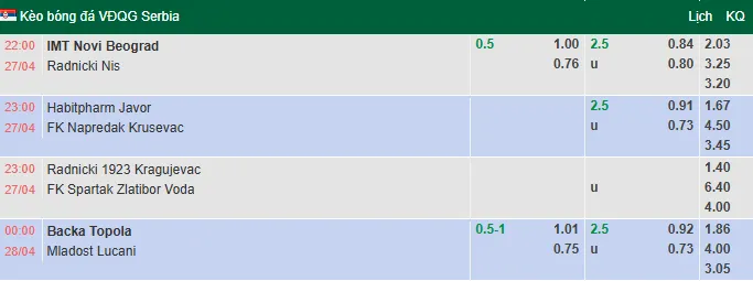 Nhận định bóng đá IMT Belgrad vs Radnicki Nis, 22h00 ngày 27/4/2026 tại giải VĐQG Serbia. Dự đoán, phân tích tỷ lệ kèo châu Âu, châu Á trận IMT Belgrad đấu vs Radnicki Nis từ các chuyên gia hàng đầu.
