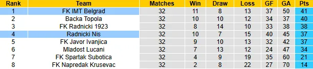 Sau 32 vòng đấu, IMT Belgrad đang tạm dẫn đầu nhóm này nhờ chuỗi 5 trận bất bại liên tiếp (thắng 2, hoà 3). Gần đây nhất, đội bóng thủ đô đã gây bất ngờ khi đánh bại Backa Topola với tỷ số 3-1 ngay trên sân khách và sau đó là 1 chiến thắng và 1 trận hoà.
