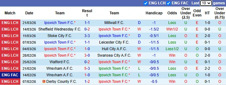 Thống kê phong độ 10 trận gần nhất của Ipswich Town