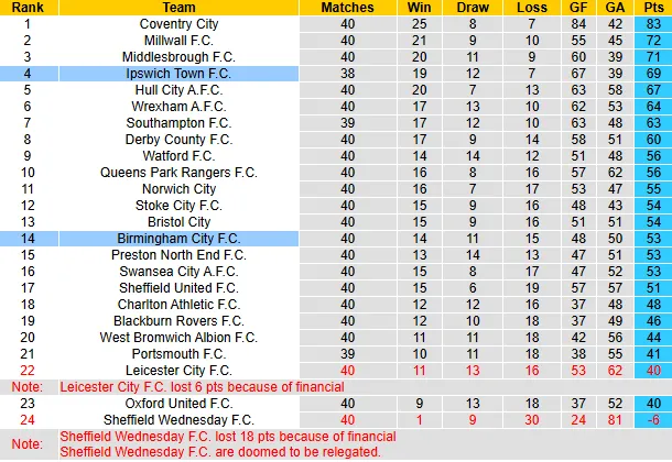 Thống kê phong độ, lịch sử đối đầu Ipswich Town vs Birmingham City