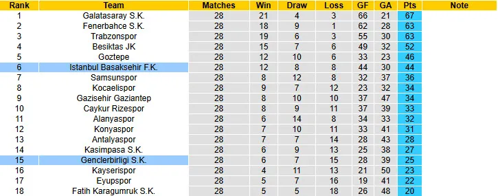 Thống kê phong độ, lịch sử đối đầu của Istanbul Basaksehir vs Genclerbirligi