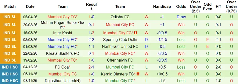 – Thống kê kết quả 10 trận gần nhất của Mumbai City