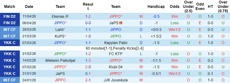 Hai đội cũng đã trải qua hai vòng đấu thuộc khuôn khổ Ykkosliiga 2026. Kết quả: JIPPO bất bại toàn bộ 2 trận còn MP Mikkeli thua cả 2. JIPPO hòa không bàn thắng với JaPS (sân nhà) rồi hạ Ekenas với tỷ số 2-1 (sân khách). MP Mikkeli lần lượt thua SJK Akatemia (0-1, sân khách) và FC KTP (0-1, sân khách).