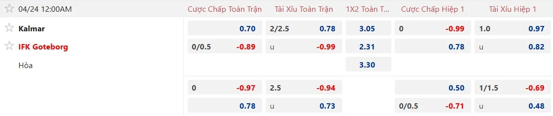 Nhận định soi kèo Kalmar vs Goteborg, 00h00 ngày 24/4 tại giải VĐQG Thụy Điển. Phân tích tỷ lệ kèo, dự đoán kết quả Kalmar vs Goteborg từ tỷ lệ châu Âu, châu Á qua các chuyên gia hàng đầu.